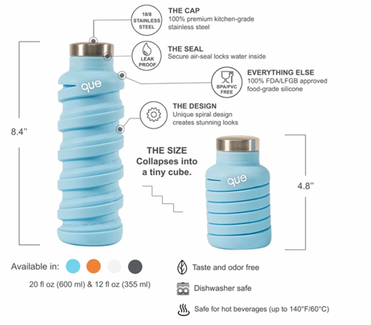 que Bottle은 어디서나 사용이 가능하지만, 제작된 의도는 여행시 편리하게 가지고 다닐수 있는 물병이니만큼, 움직임이 많은 활동 시 유용하게 사용할 수 있을 것 같습니다. 소재 특성상 가벼워 이동시 편리하고 사이즈 조절이 가능해 작은 공간에 보관도 용이합니다. 단단한 소재가 아니기 때문에 움직임이 많은 이동 시 부상의 위험을 줄 일 수 있고 일반 플라스틱 텀블러와는 다르게 특수 실리콘소재로 만들어졌기 때문에 깨짐이나 파손 등과 같은 위험을 줄였습니다.