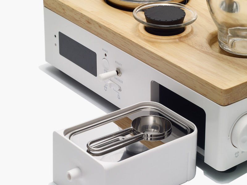 사실 제품의 상단에 비커나 호수 등 복잡한 물체가 있어 자칫 지저분해 보이거나 과학실 같은 투박한 느낌이 날 수도 있었지만, 커피 메이커 하단에는 나무 받침대가 자리하고 나무 받침대를 기준으로 아래쪽은 제품 느낌이 위쪽은 레트로적인 아기자기한 구조를 통해 오히려 더욱 엔틱 한 느낌을 주는 것 같다. 제품의 버튼을 미니멀하게 없애기보단 제품 외각에 남겨두고, 스푼 서랍과 같은 구조를 더해 커피와 잘 어울리는 뉴트로 한 제품 디자인이 된 것 같다. 전혀 합쳐지지 않을 것 같은 알람과 커피머신을 결합해 기능뿐만 아니라 유니크한 디자인을 원하는 사용자들과 품위 있는 아침을 즐기고 싶은 사용자들에게 안성맞춤인 제품이다.