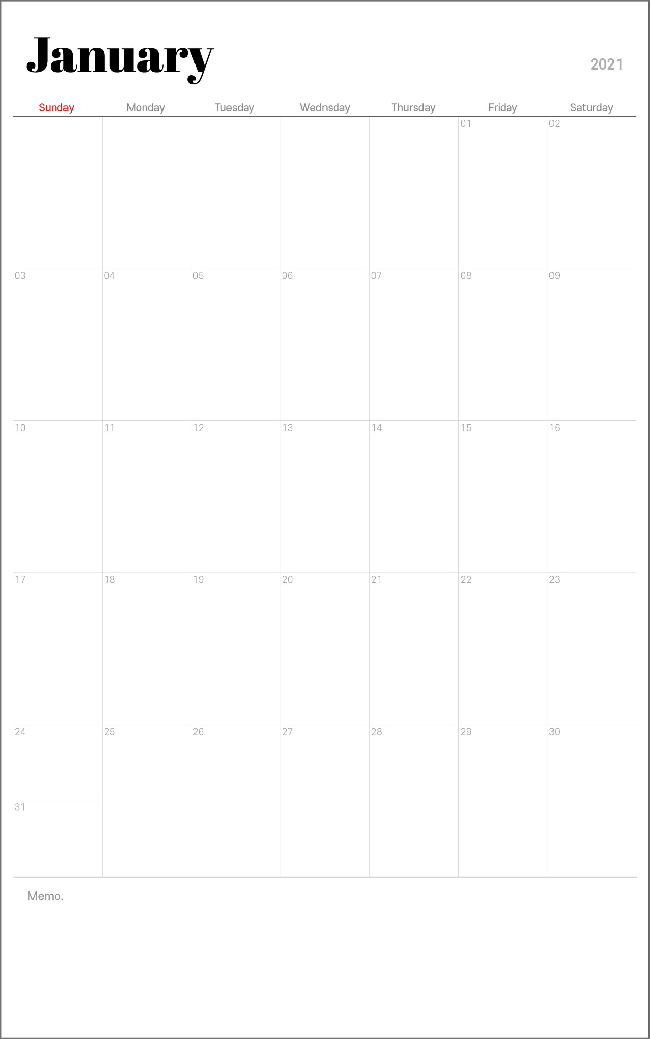 모두 1월부터 12월까지 구성되어 있습니다. 왼쪽 위에 보시면 영어로 월이 적혀있습니다. 레이아웃은 최대한 공간을 많이 활용할 수 있게 크게 크게 디자인했습니다. 확대하셔서 자기 스케줄을 하나하나 채워가면서 정리하면 스케줄 관리하기 편하답니다. 또 하단 남은 공간에 매월 중요한 것들을 메모할 수 있는 공간을 만들었습니다. 항상 월 단위로 중요한 것들이 생기더라고요. 하단에 있는 작은 공간에 정리하면 될 것 같습니다.