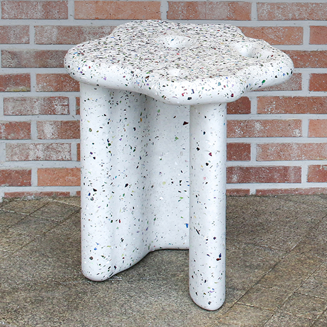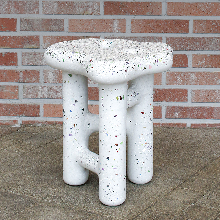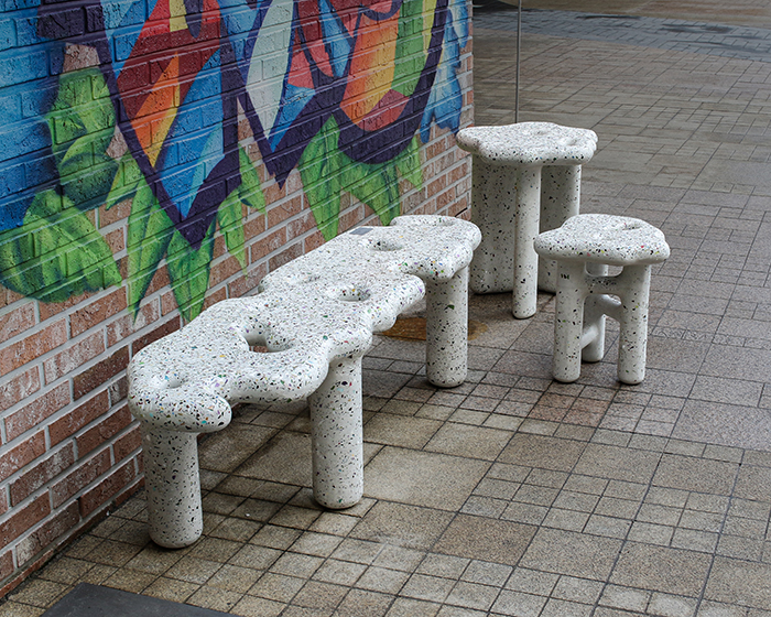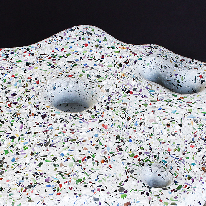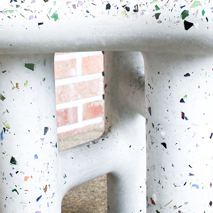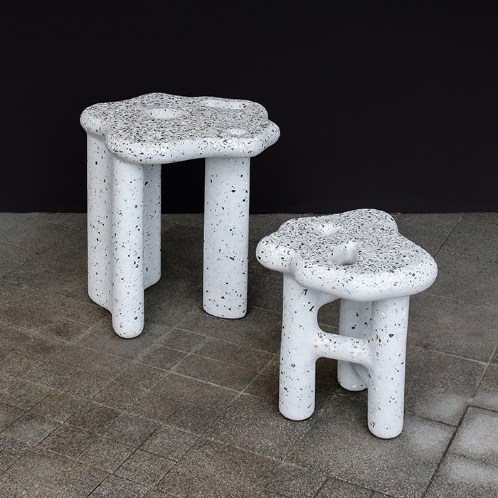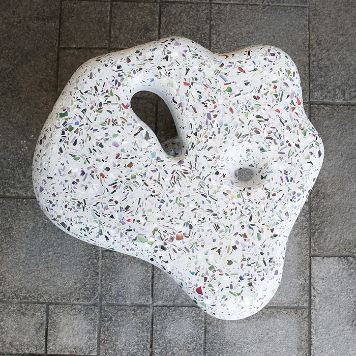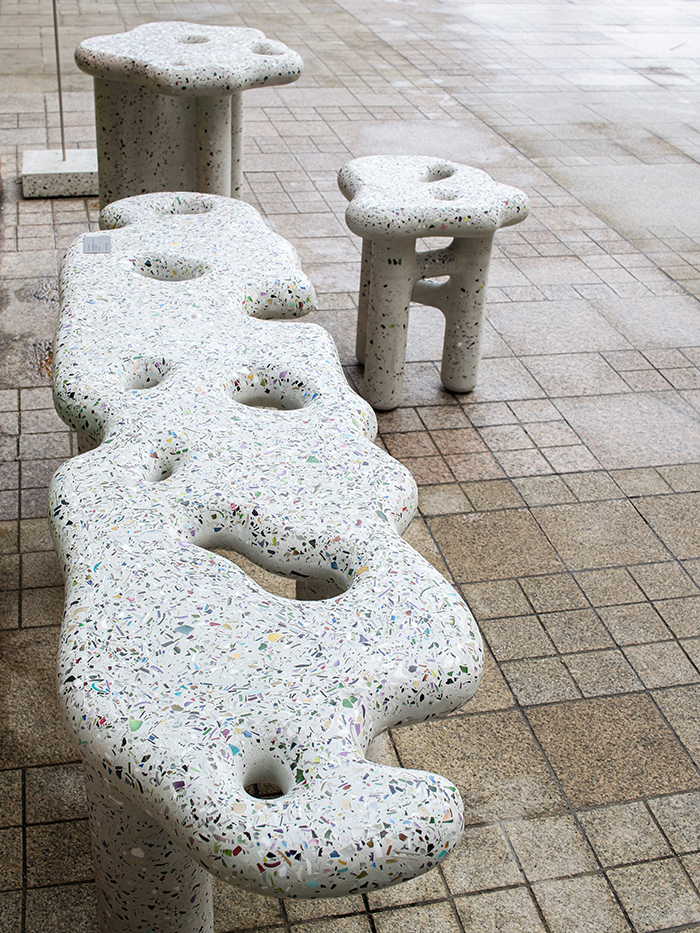 실제로 가구들을 보면 정형화 되어있지 않고 유기적인 형상을 나타냅니다. 의자의 형상을 가지고 있지만 윗판과 의자 다리 뭐 하나 정형화되어있지 않은데요. 이 형상들은 바다에 떠 있는 플라스틱 조각들로 이루어진 섬(GPGP)을 형상화한것이라고 합니다. 유기적인 콘크리트 속에 혼합된 플라스틱 조각들은 마치 테라조 타일처럼 보여 시각적으로 재미있는 느낌까지 듭니다. 콘크리트 속에 박혀있는 플라스틱 조각들이 모르고 볼땐 단순히 예쁘지만, 그 의미를 알고 보면 정말 바다위를 떠다니는 촘촘한 플라스틱들 같아 마음이 아프네요.