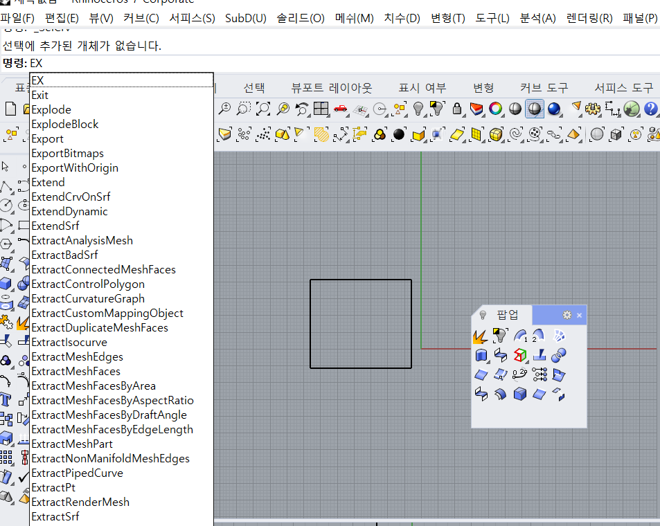 모델링을 빠르게 하기 위해서는 단축키 설정이 중요합니다. 특히 라이노의 경우 아이콘으로 되어있는 명령어들을 찾아 하나하나 누르게 되면 꽤 많은 시간을 허비하게 됩니다. 라이노는 아래 이미지처럼 라이노 상단에 명령어 창에 명령어를 입력하면서 작업을 진행할 수 있습니다. 자주 쓰는 명령어들은 팝업박스에 담아두거나 명령어을 설정해 두는 게 좋습니다.