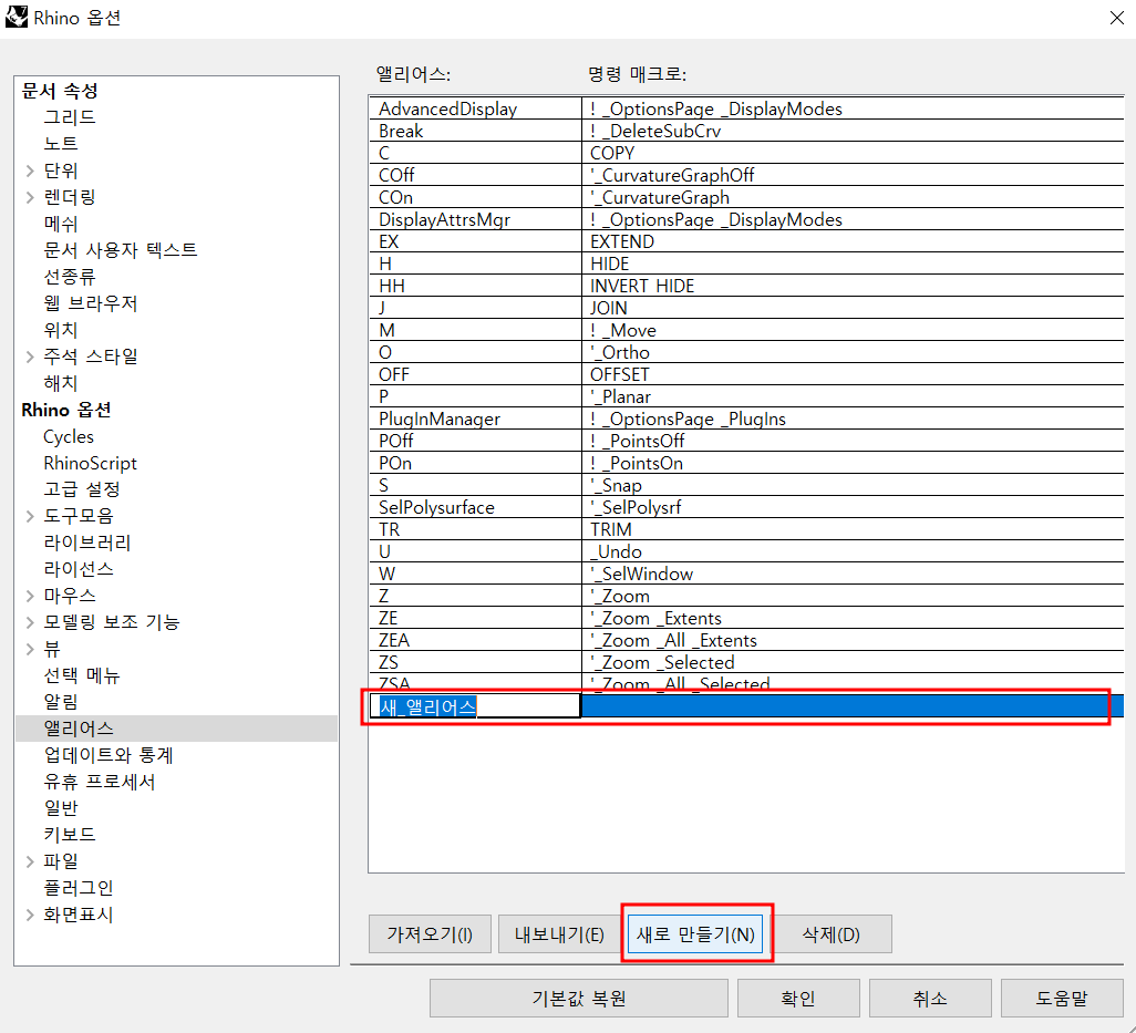 이곳에서 명령어를 저장하면 되는데, 여기서 새로 만들기를 클릭하여 단축키를 등록하면 됩니다. 예를 들어 왼쪽 앨리어스에는 ex를 입력하고 명령 매크로에 extend를 입력하면 ex만 눌러도 extend가 실행됩니다. 또 이렇게 저장한 명령어들은 내보내기를 통해 저장할 수 있으며 가져오기를 통해 다른 사람의 명령어를 불러와 적용할 수도 있습니다.