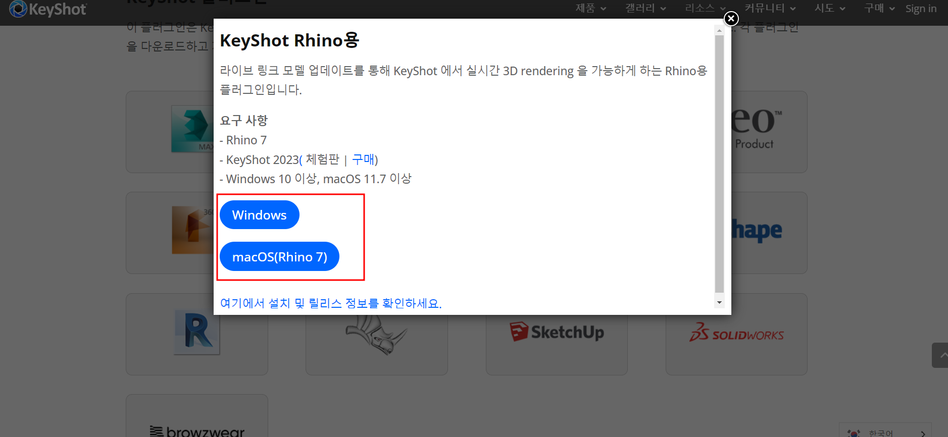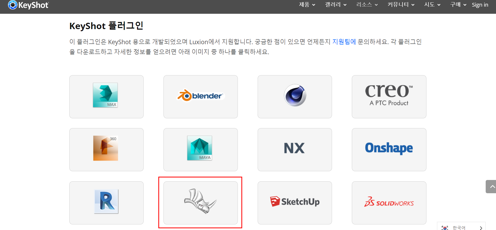 위 링크로 들어가 아래로 내리다 보면 키샷에서 지원하는 여러 모델링프로그램의 플러그인들이 나타납니다.