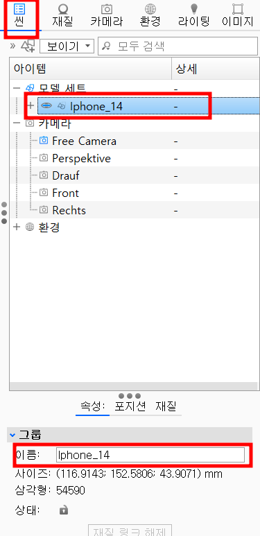 바로 파일의 이름이 같아야 한다는 것입니다. 파일의 이름이 바뀔 경우 키샷에서 같은 파일이라고 인식하지 못해 업데이트가 되지 않습니다. 이럴 경우 키샷 프로젝트 탭에서 씬으로 들어간 뒤 아일 이름을 라이노 파일과 같게 바꿔준다면 다시 업데이트가 가능하게 됩니다.
