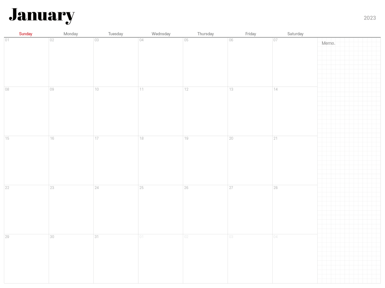 1월부터 12월까지 구성되어있으며 왼쪽 위에 월이 나타나 있습니다. 최대한 많은 스케줄을 적을 수 있게 큰 레이아웃으로 디자인을 진행했습니다. 우측 공간에는 매월 중요한 일을 메모할 수 있는 공간을 마련하였습니다.