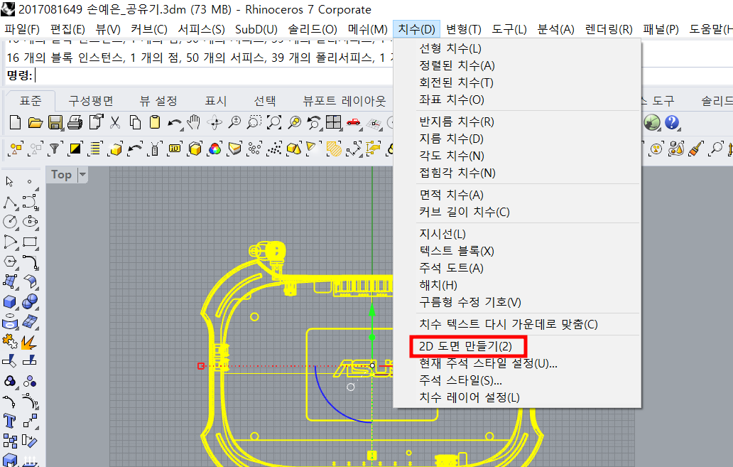 2. 치수 (dimension) 메뉴 - 2D 도면 만들기 (make 2-D drawing)