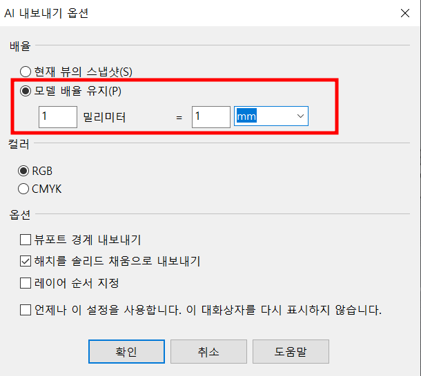도면이 원하는 데로 추출되었다면 ai파일이나 도면파일인 dwg파일로 저장해서 사용할 수 있습니다. 저장할 때 중요한 점은 모델의 배율을 유지하는 것입니다. 1mm는 저장 후에도 같은 배율을 유지할 수 있게 1mm로 설정해서 저장을 해줘야 다른 프로그램에서 켰을 때 비율이 달라지지 않습니다.