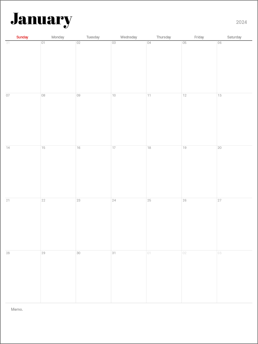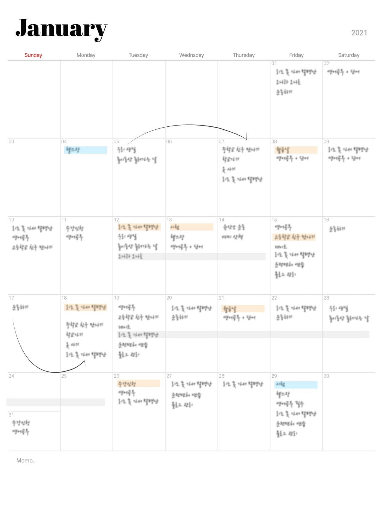 모두 1월부터 12월까지 구성되어 있습니다. 레이아웃을 크게 잡아 최대한 공간활용을 할 수 있게 디자인 하였습니다. 확대해서 스케줄을 채워나가면서 정리하면 한 달의 스케줄을 정리하기 아주 편하답니다. 또 하단에 남은 공간에는 매월 중요한 것들을 메모할 수 있는 공간을 만들었습니다. 항상 월 단위로 중요한 것들이 생기더라고요. 하단에 있는 작은 공간에 정리하면 될 것 같습니다.
